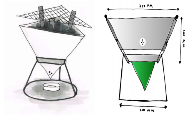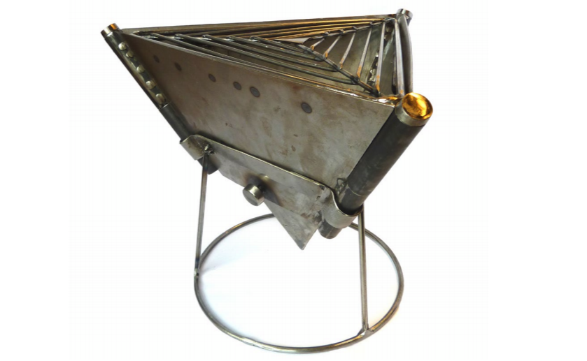 The shape of the product is based on tortilla chips. It is being suspended by a wire construction. The shape has been made up by 2 baskets falling into each other, the room between these baskets make room for air. while the ashes are still collected. The button on the bottom of the top basket controls the airflow.